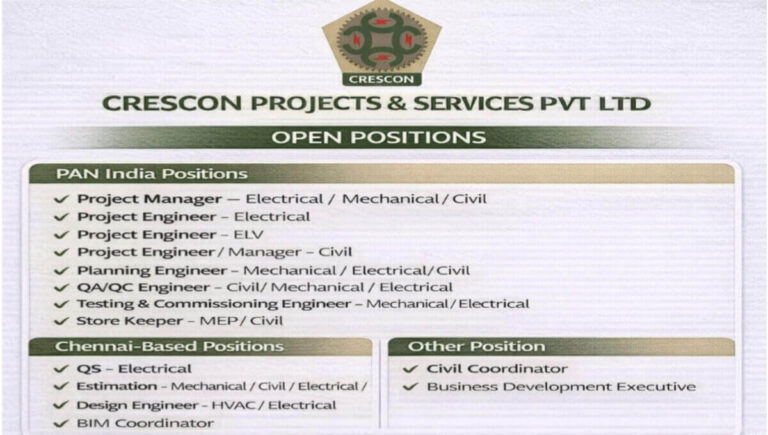 CRESCON Projects & Services Pvt Ltd Vacancy | Electrical, Mechanical, Civil, HVAC, ELV, MEP, Planning, QA/QC Company Name CRESCON Projects …