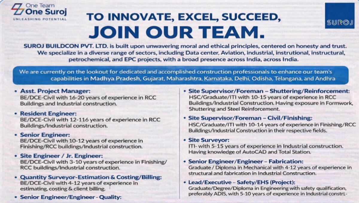 Suroj Buildcon Pvt Ltd Walk In Interview | HSC, ITI, Diploma, BE and Degree Company Name Suroj Buildcon Pvt. Ltd. …
