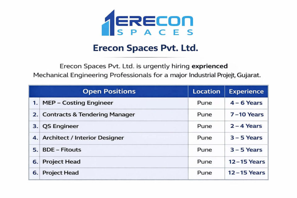 Erecon Spaces Pvt Ltd Vacancy | For Corporate Interior Projects | At Pune Location Company Name Erecon Spaces Pvt. Ltd. …