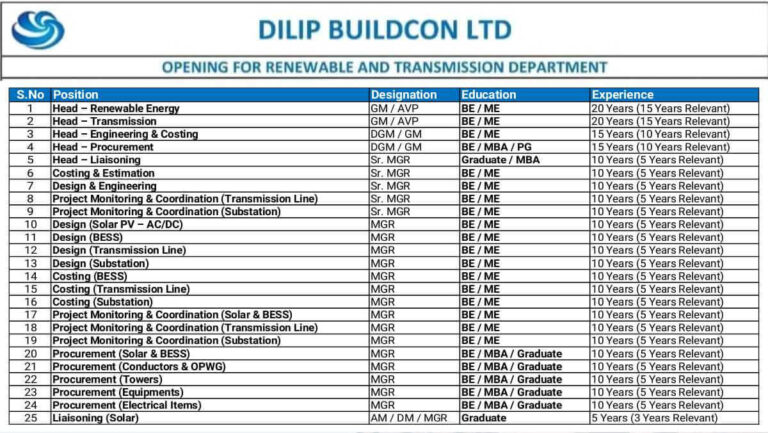 Dilip Buildcon Ltd Recruitment 2026 | GM, DGM, Manager Roles in Renewable & Transmission – Apply Now! Company Name Dilip …