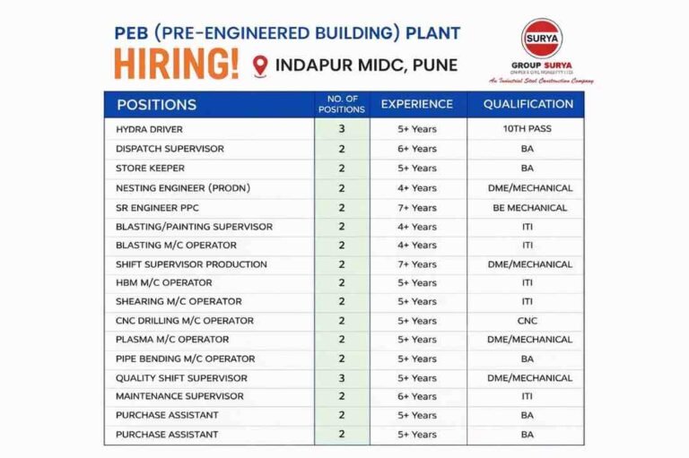 Group Surya Recruitment 2026 | 10th, ITI, Diploma, BE and Degree | Construction Job Company Name Group Surya PEB (Pre-Engineered …