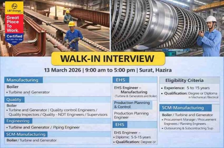 L&T Energy Walk In Interview | for thermal power plants, executing coal-based BTG (Boiler-Turbine-Generator) projects Company Name L&T Energy L&T …