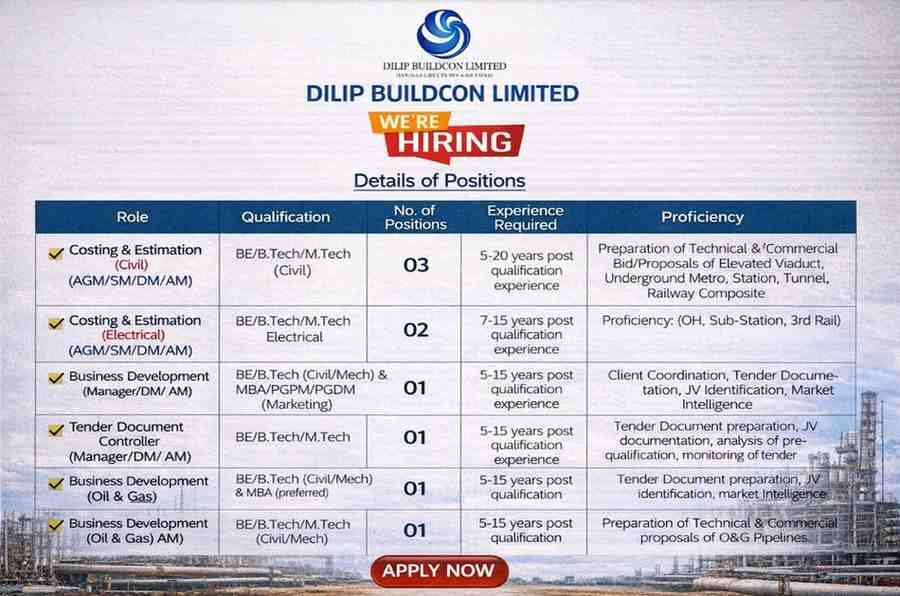 Dilip Buildcon Limited Recruitment 2026 | For Railway, Urban Transportation, and Oil & Gas Business Development Projects Company Name Dilip …