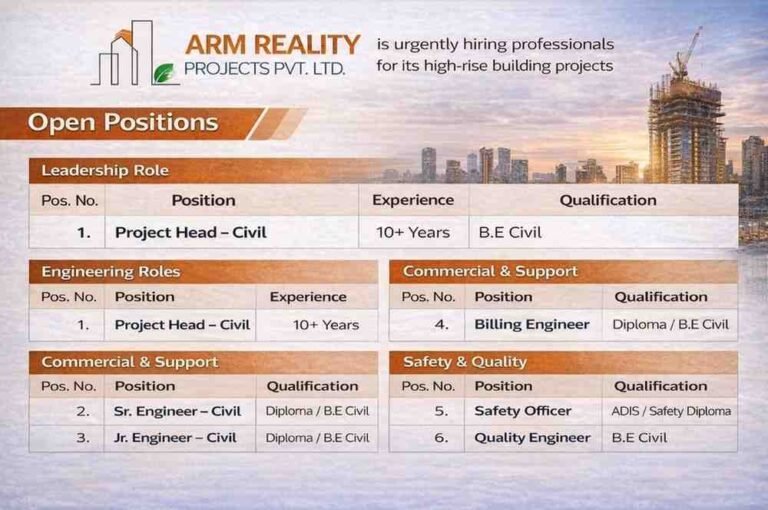 ARM Reality Pvt Ltd Recruitment 2026 | For Execution, Billing, Safety, and Quality Roles Company Name ARM Reality Pvt. Ltd. …