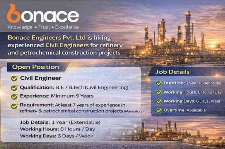 Bonace Engineers Pvt Ltd Vacancy | For Civil Engineer Refinery & Petrochemical Projects Company Name Bonace Engineers Pvt. Ltd Bonace …