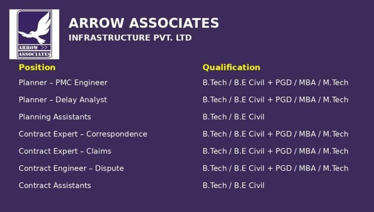 Arrow Associates Infrastructure Vacancy 2026 | For Metro / Railway project Company Name Arrow Associates Infrastructure Pvt. Ltd Arrow Associates …