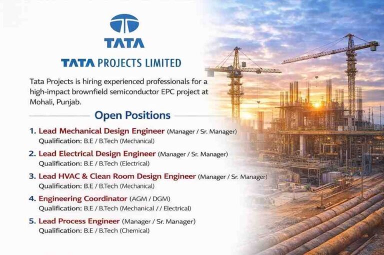 Tata Projects Vacancy 2026 | For Infrastructure Projects in India Company Name Tata Projects Tata Projects is hiring experienced professionals …