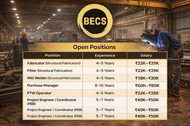 BECS Urgent Requirement 2026 | For PEB (Pre-Engineered Building) Projects Across Multiple Locations Company Name BECS BECS is hiring skilled …