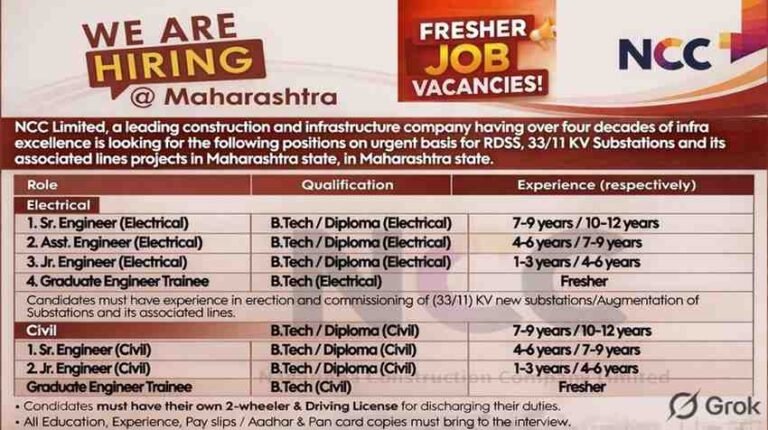 NCC Limited Recruitment 2026 | For RDSS, 33/11 KV Substations and Associated Lines Projects Company Name NCC Limited NCC Limited is a …
