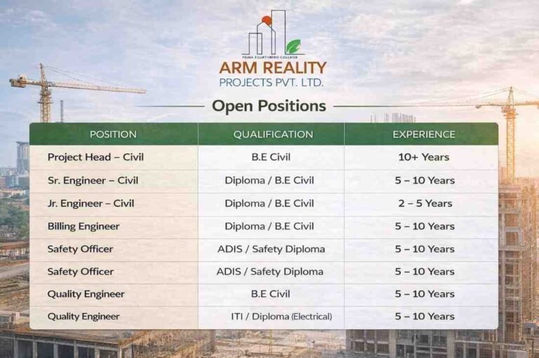 ARM Reality Immediately Hiring 2026 | For High-rise and Infrastructure Projects Company Name ARM Reality Projects Pvt. Ltd. ARM Reality …