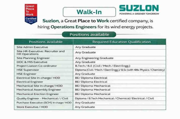 suzlon Walk-in Interview April 2026 | For Wind Energy Projects across India Company Name suzlon Suzlon, a Great Place to …