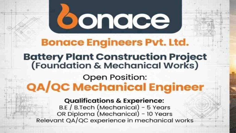 Bonace Engineers Requirement 2026 | For QA/QC Mechanical Engineer Construction Project Company Name Bonace Engineers Pvt. Ltd. Bonace Engineers Pvt. …
