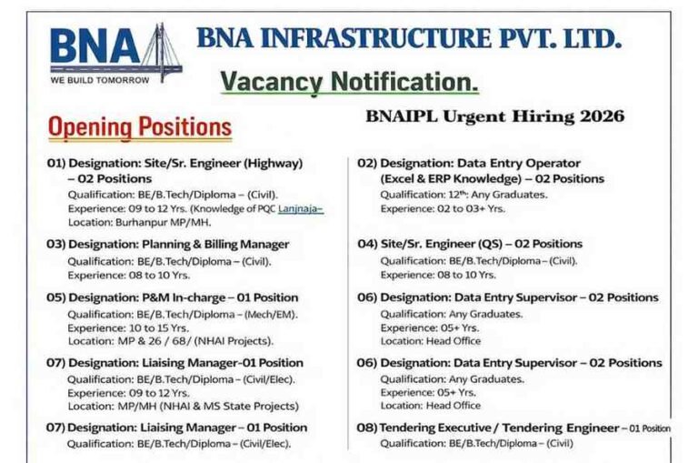 BNA Infrastructure New Job Opening | Highway, NHAI, and Infrastructure Project | For B,E / B,Tech / Diploma Degree Company …
