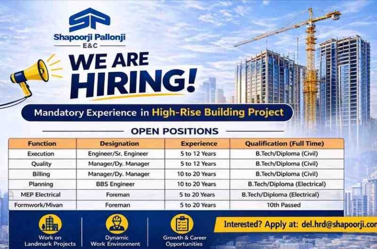 Shapoorji Pallonji Recruitment 2026 | For High Rise Building Projects | 10th, Diploma, and B.tech Job