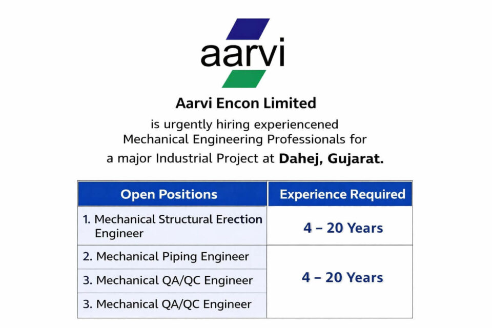 Aarvi Encon Limited is urgently hiring experienced Mechanical Engineering Professionals for a major Industrial Project at Dahej, Gujarat.