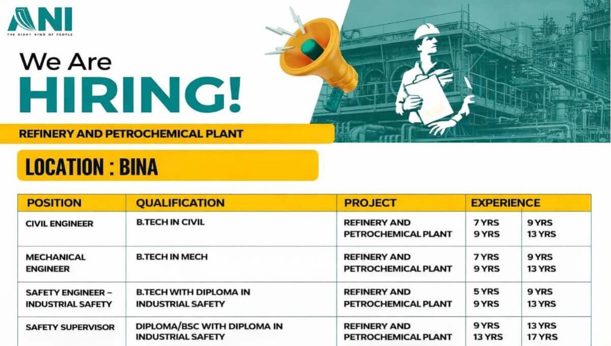 ANI Integrated is inviting experienced professionals to join its Refinery & Petrochemical Plant project at Bina. This is an excellent opportunity for qualified Civil, Mechanical, and Safety professionals with strong industrial project exposure to work on large-scale refinery and petrochemical developments.