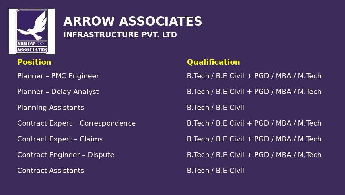 Arrow Associates Infrastructure Vacancy 2026 | For Metro / Railway project