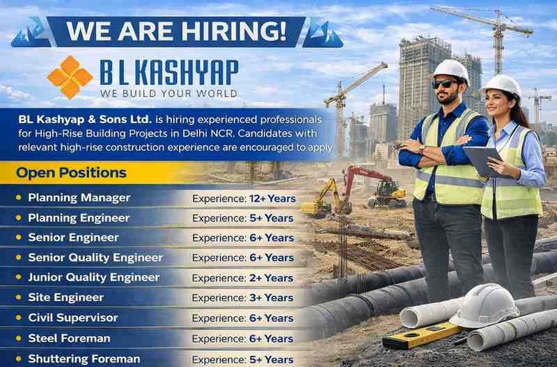 BL Kashyap & Sons Ltd. is hiring experienced professionals for High-Rise Building Projects in Delhi NCR. Candidates with relevant high-rise construction experience are encouraged to apply.
