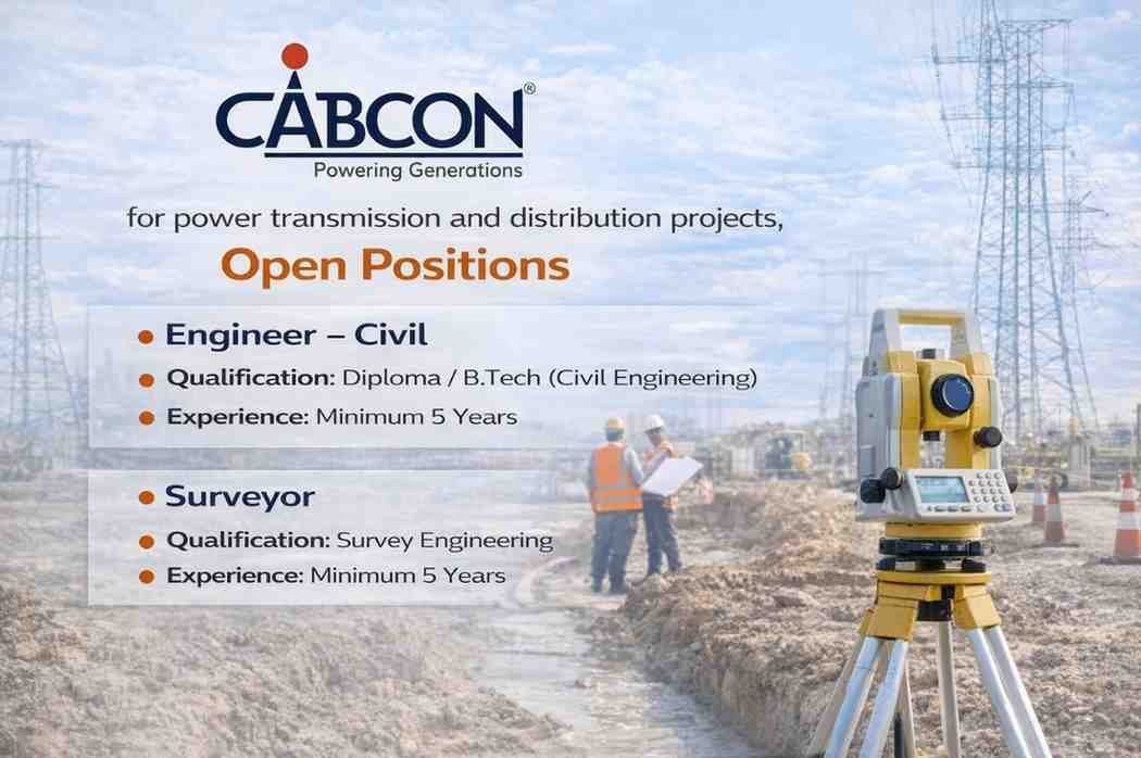 Cabcon India Limited, an ISO-certified company engaged in manufacturing and EPC services for power transmission and distribution projects, is hiring experienced professionals. The company is looking for candidates with expertise in transmission line and grid substation (GSS) projects.