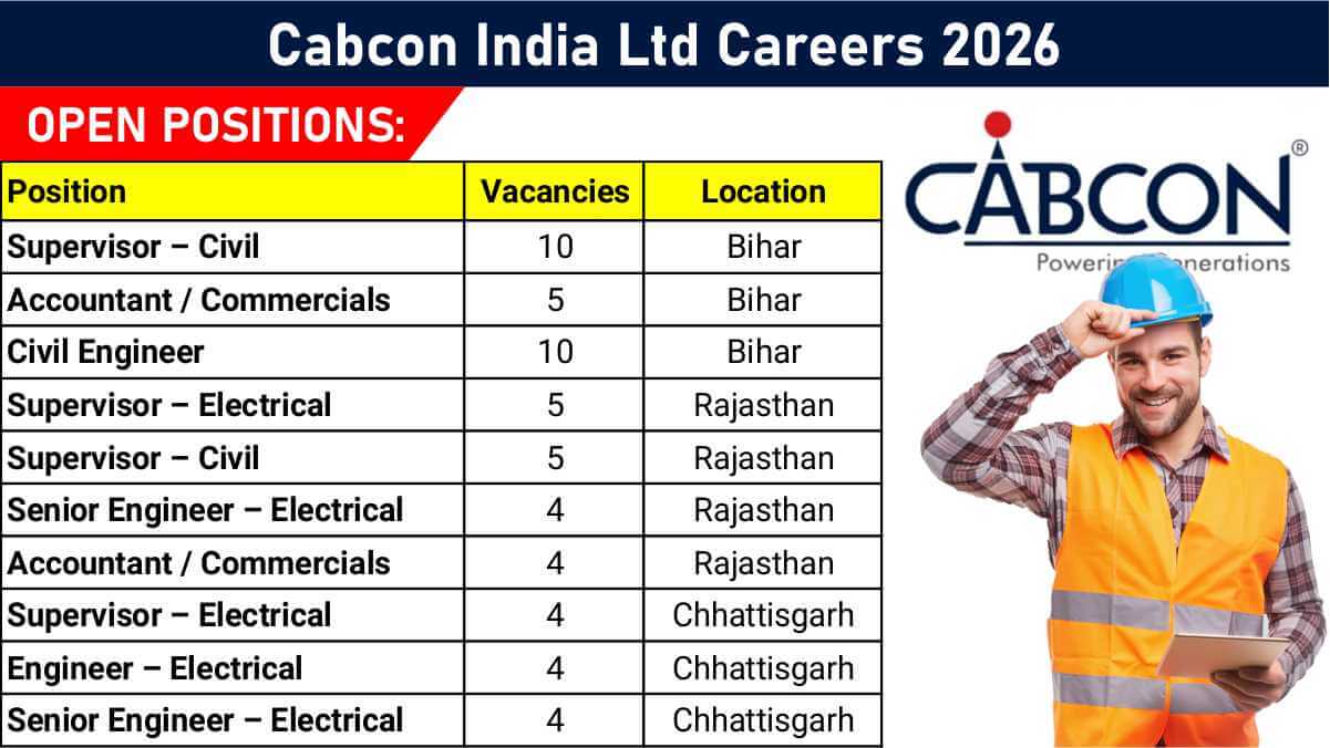 Cabcon India Ltd Careers 2026 | Civil, Electrical & Accountant Jobs in Bihar, Rajasthan & Chhattisgarh | 33/11 KV Substation & LT/HT Line Jobs