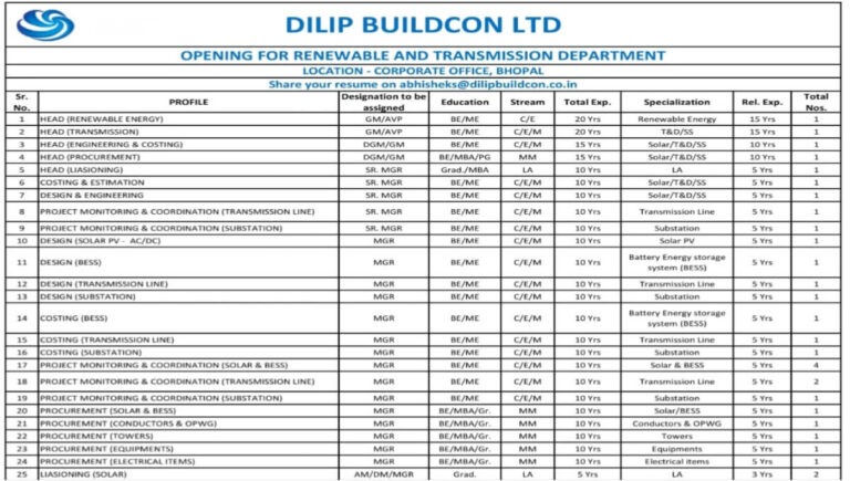Dilip Buildcon Ltd Hiring 2026 | For Renewable And Transmission Department Company Name Dilip Buildcon Ltd OPENINGS – RENEWABLE & …