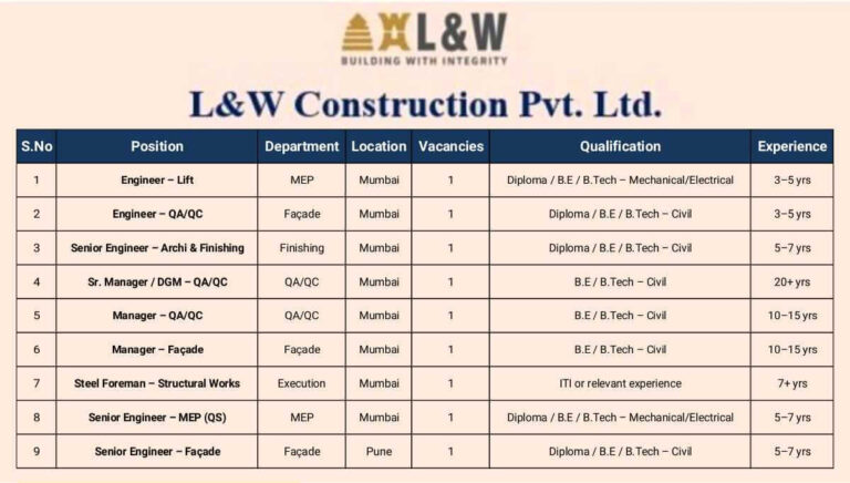 L&W Construction Pvt Ltd Hiring 2025 | High-Rise Building Jobs Mumbai & Pune Company Name …