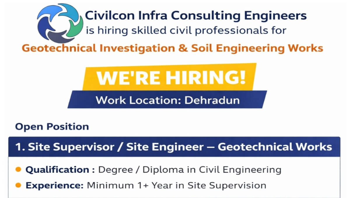 Civilcon Infra Consulting Engineers is hiring skilled civil professionals for Geotechnical Investigation & Soil Engineering Works in Dehradun.