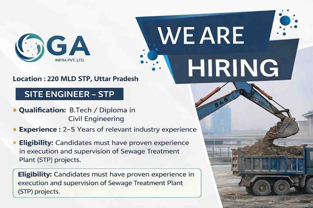 GA Infra Pvt. Ltd. is hiring a Site Engineer for a 220 MLD Sewage Treatment Plant (STP) Project in Uttar Pradesh. Candidates with experience in STP project execution and supervision are encouraged to apply.