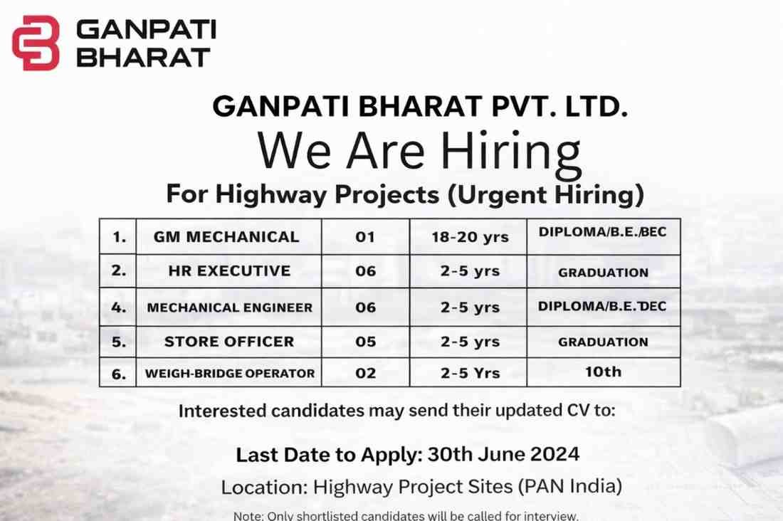 Ganpati Bharat Pvt Ltd Vacancy | For Highway Projects | Diploma, Be and B.tech Job