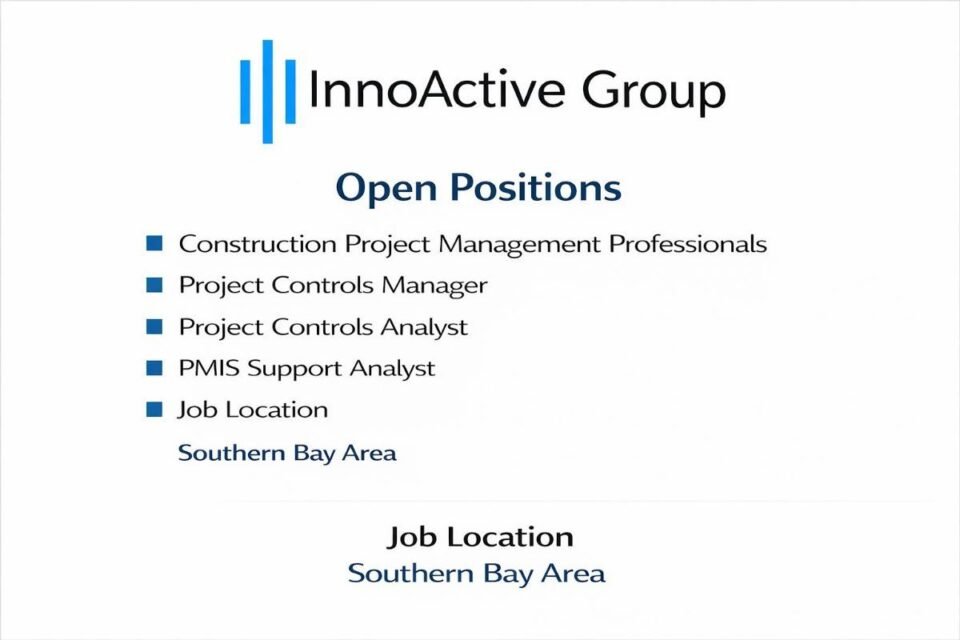 InnoActive Group is expanding its team and hiring professionals for its Project Management, Project Controls, and Digital Transformation teams in the Southern Bay Area. The company is looking for motivated and passionate individuals who want to grow in construction and project management domains.