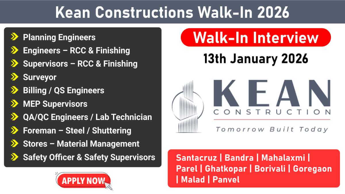 Kean Constructions Walk-In 2026 | RCC, Finishing, MEP & Safety Jobs Open | Interview 13 Jan 2026 | Don’t Miss This Walk-In Interview