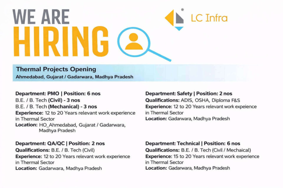 We’re expanding our Thermal Projects team! LC Infra seeking experienced engineers for PMO, QA/QC, Safety and Technical roles in Ahmedabad and Gadarwara. Join our Class AA infrastructure company with 30 years of excellence. Shape India’s energy future with us!
