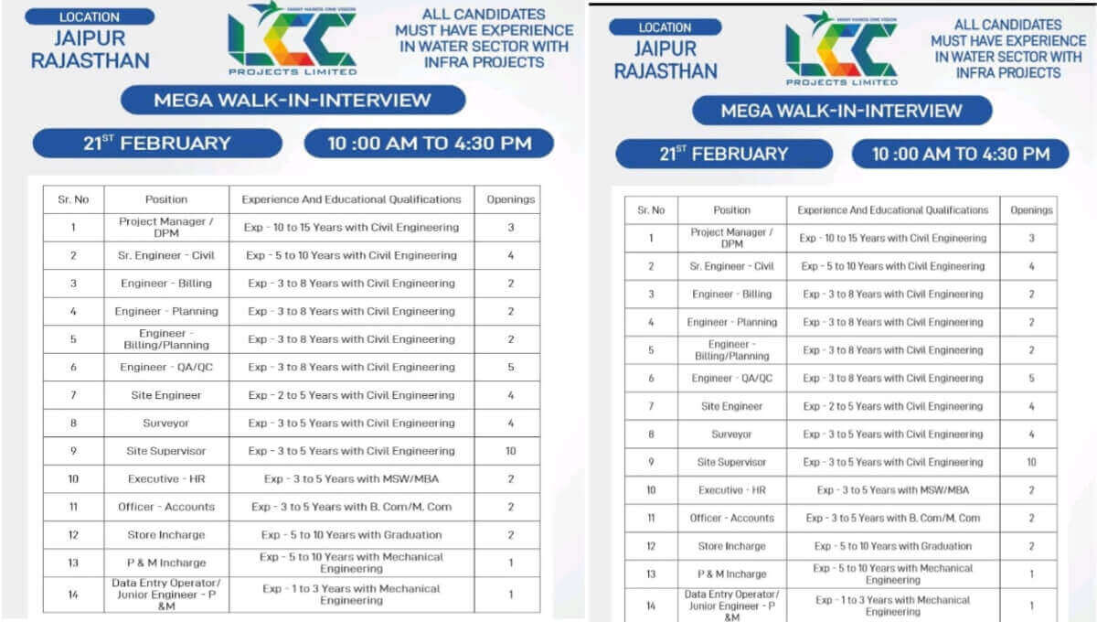 LCC Projects Limited is inviting experienced professionals for its ongoing Water Sector Infrastructure Projects.