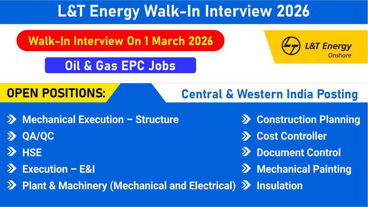 L&T Energy Walk-In Interview 2026 | Oil & Gas EPC Jobs | Walk-In Interview On 1 March 2026 | Central & Western India Posting
