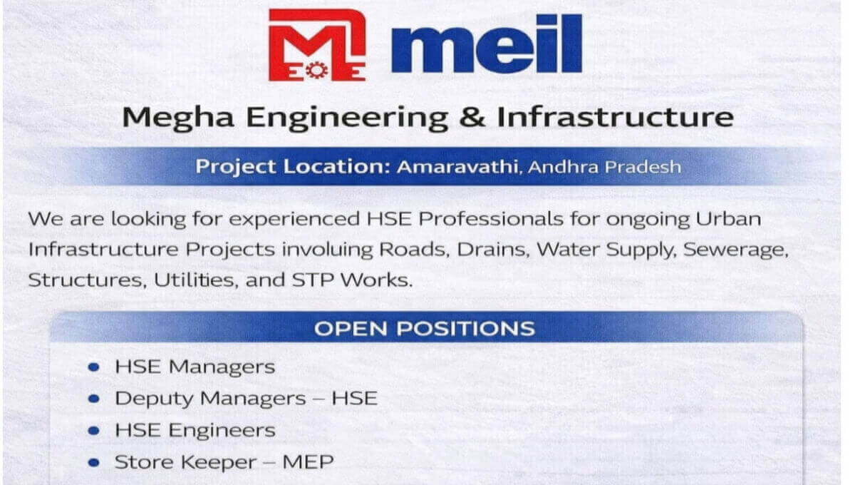We are looking for experienced HSE Professionals for ongoing Urban Infrastructure Projects involving Roads, Drains, Water Supply, Sewerage, Structures, Utilities, and STP Works.