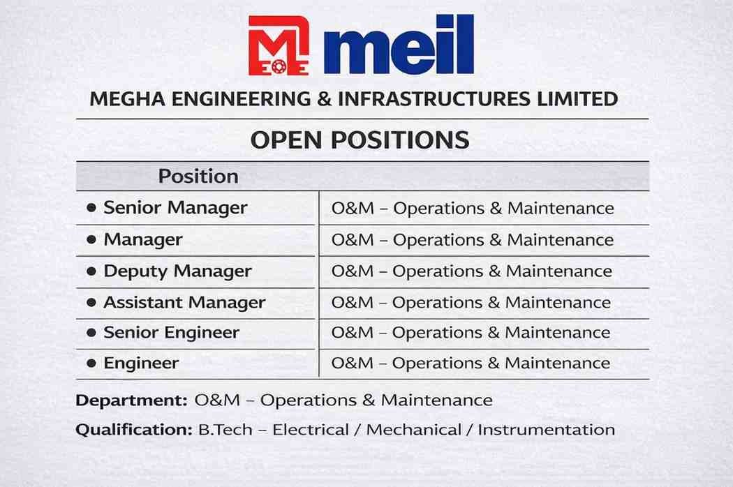 Megha Engineering & Infrastructures Limited (MEIL) is inviting applications from experienced professionals for Operations & Maintenance (O&M) roles. Candidates with technical expertise in Electrical, Mechanical, and Instrumentation systems are encouraged to apply.