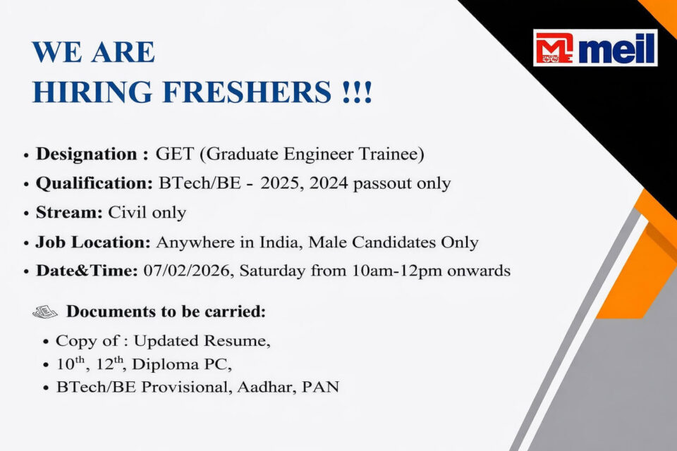 Megha Engineering & Infrastructure Limited (MEIL) is inviting fresh Civil Engineering graduates to kick-start their careers through a Walk-In Interview for the position of Graduate Engineer Trainee (GET). This is an excellent opportunity to work with one of India’s leading infrastructure companies and gain exposure to large-scale projects across the country.