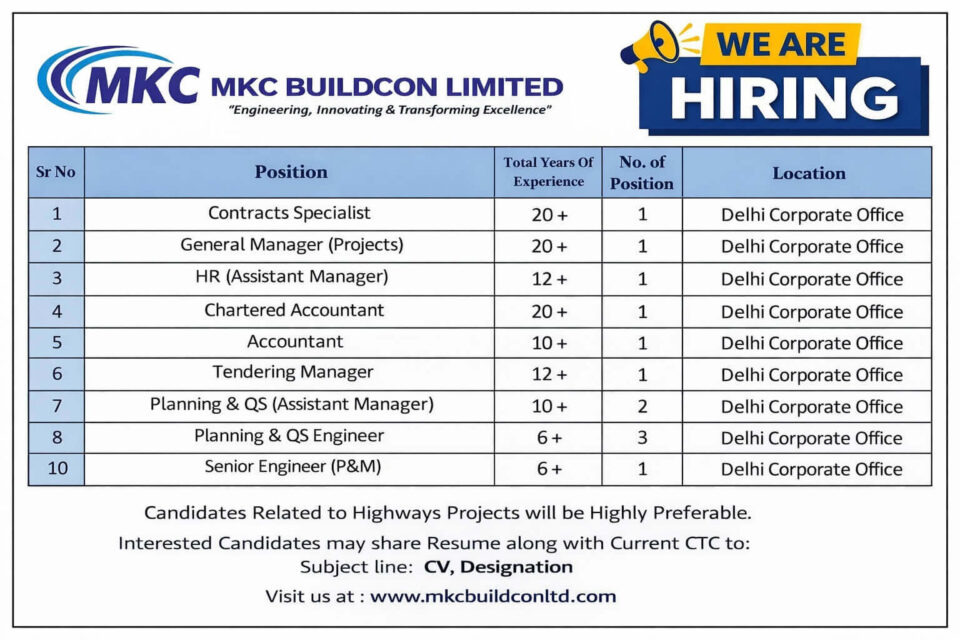 MKC Buildcon Limited Vacancy | Highway and Large infrastructure Projects