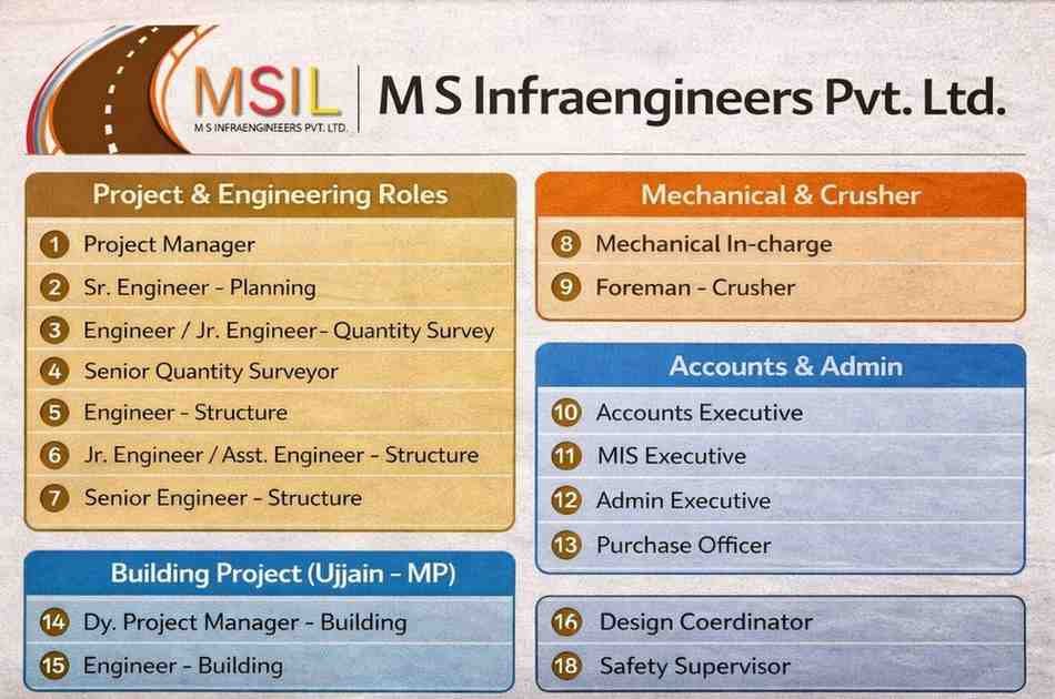 MS Infraengineers Pvt Ltd (MSIL) is hiring for multiple roles in Road Infrastructure and Building Projects across Odisha and Ujjain (MP).