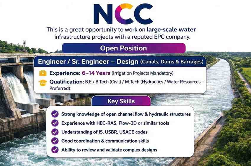 NCC Limited is hiring experienced design engineers for irrigation projects at its Head Office in Hyderabad. The role focuses on hydraulic design and review of canals, dams, and barrages.