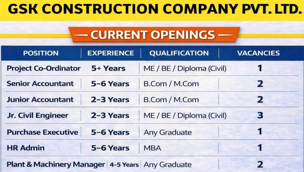 Note: Candidates should have working experience in Road & Highway Projects and be willing to work anywhere in India.