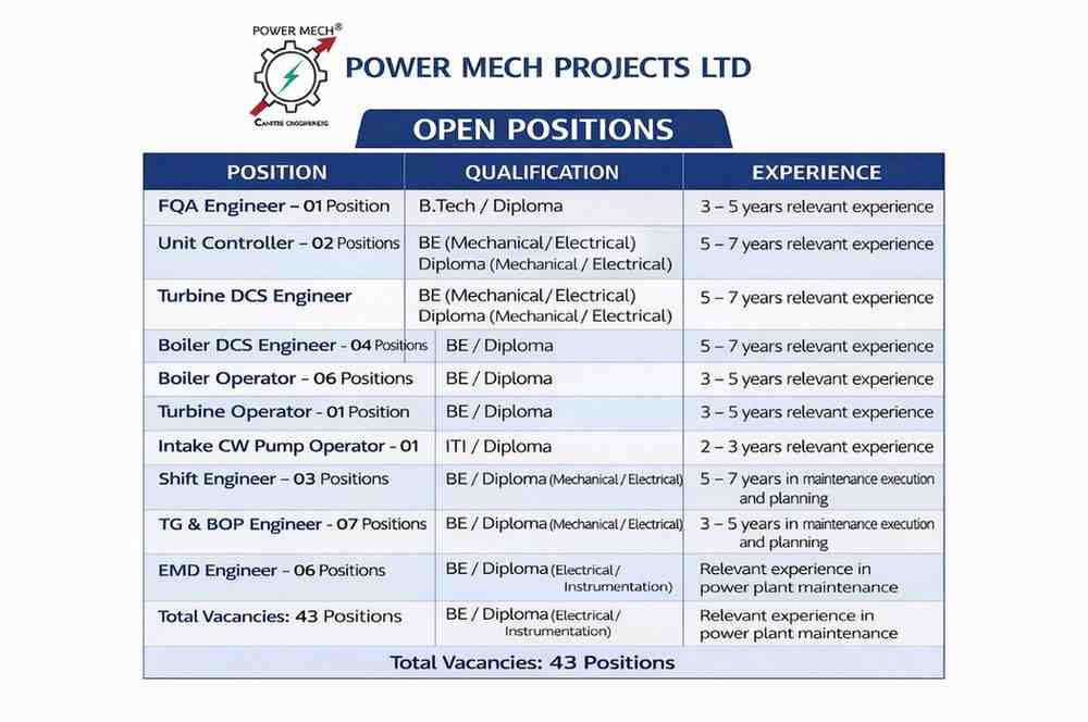 Power Mech Projects Limited Vacancy | ITI, Diploma, BE in Electrical and Mechanical Engineer
