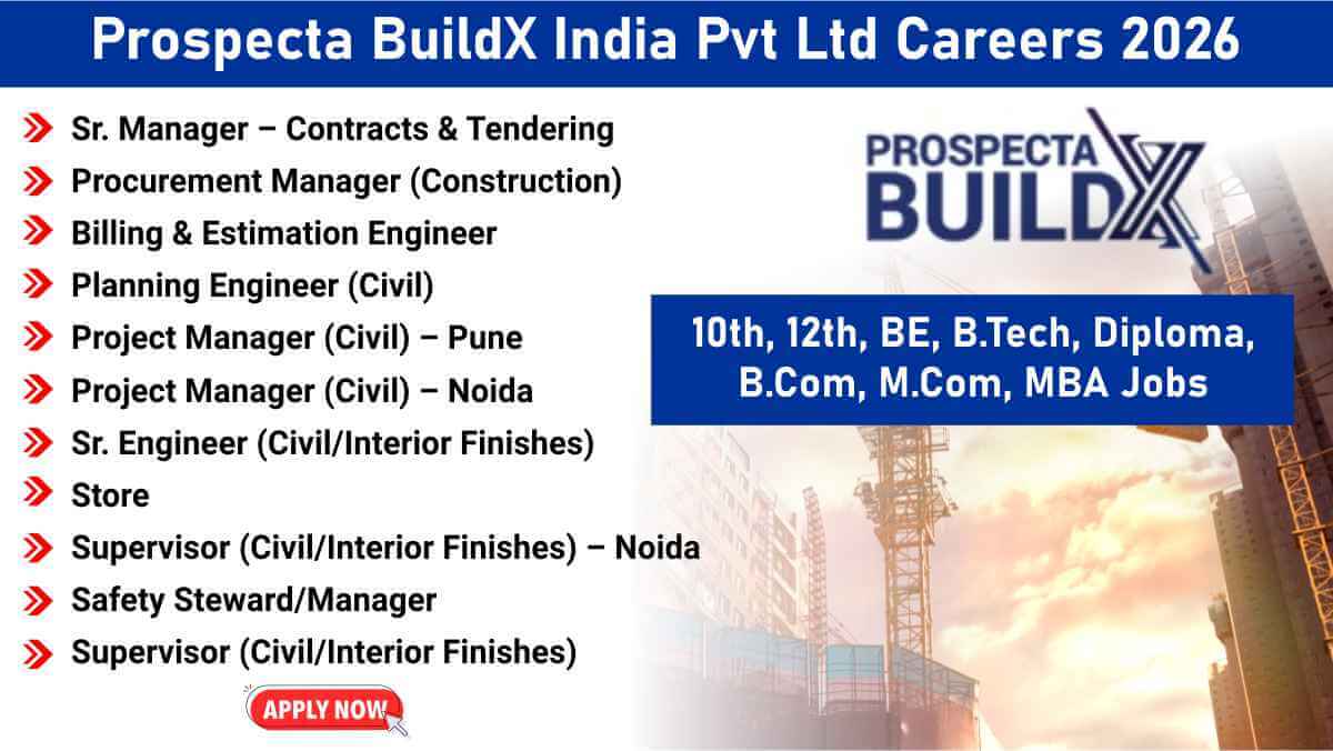 Prospecta BuildX India Pvt Ltd Careers 2026 | Pune, Noida, Bengaluru – Civil, Safety & Planning Roles | 10th, 12th, BE, B.Tech, Diploma, B.Com, M.Com, MBA Jobs