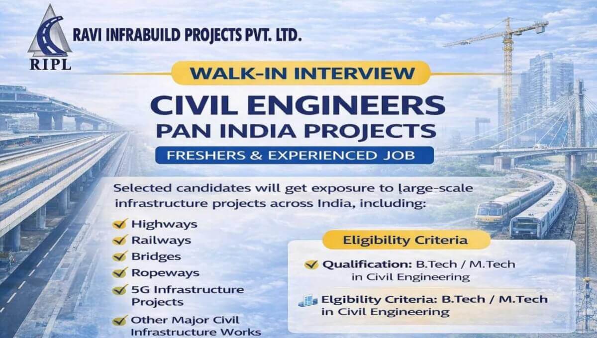 Ravi Infrabuild Projects Limited is hiring passionate and dynamic Civil Engineers for its ongoing and upcoming infrastructure projects across India. This recruitment drive is for multiple PAN India project locations.