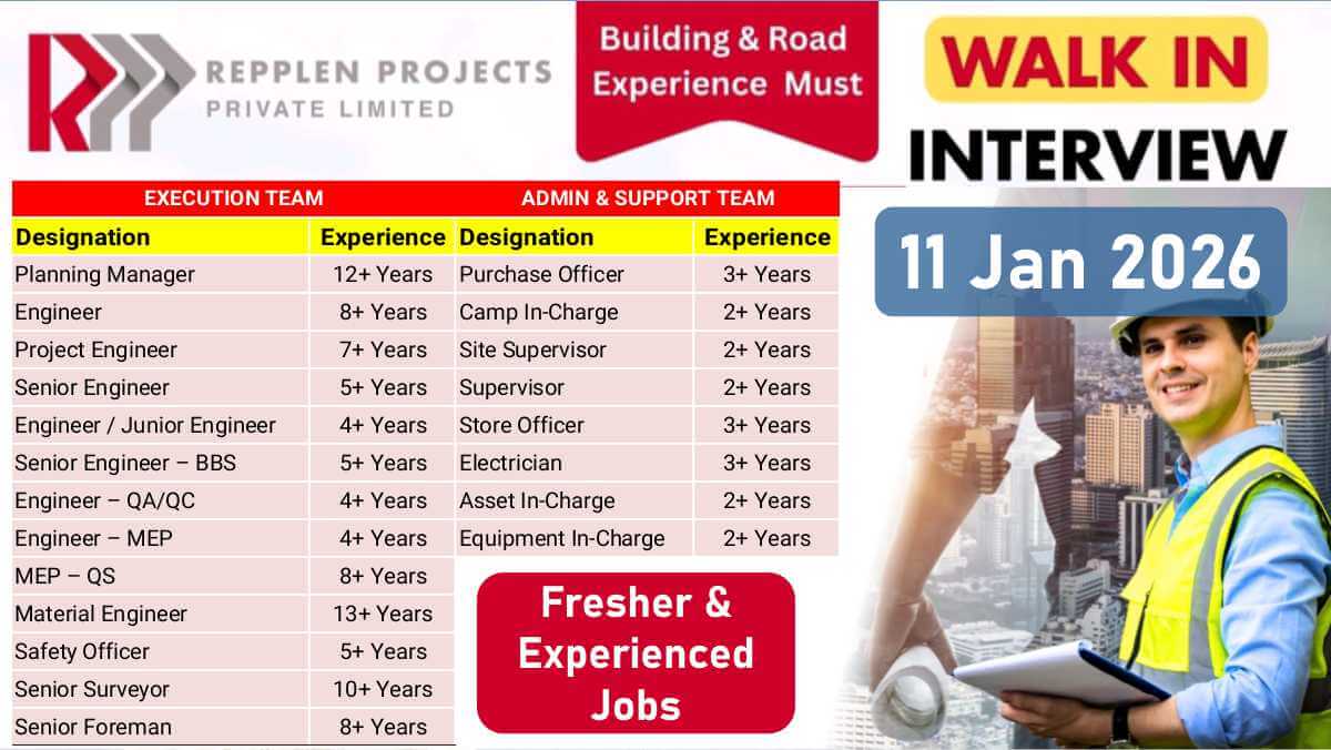 REPPLEN Projects Pvt Ltd Walk-In Interview | Planning Manager to Junior Engineer | Freshers & Experienced Jobs | Walk-In Interview on 11 Jan 2026