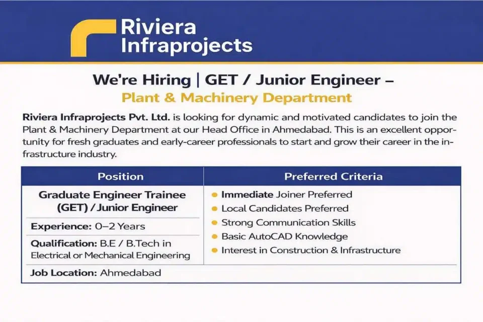 Riviera Infraprojects Pvt. Ltd. is looking for dynamic and motivated candidates to join the Plant & Machinery Department at our Head Office in Ahmedabad. This is an excellent opportunity for fresh graduates and early-career professionals to start and grow their career in the infrastructure industry.