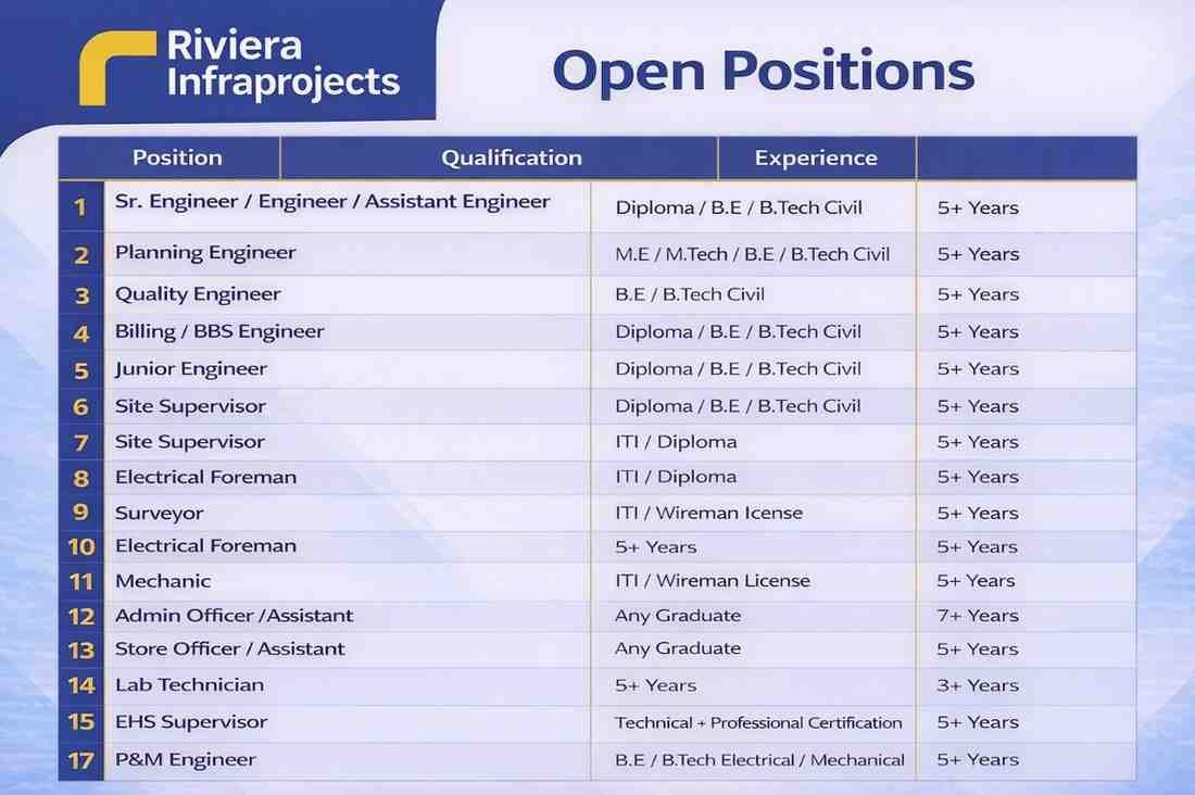 Riviera Infraprojects is hiring experienced professionals for high-rise residential and commercial building projects across multiple locations in India.