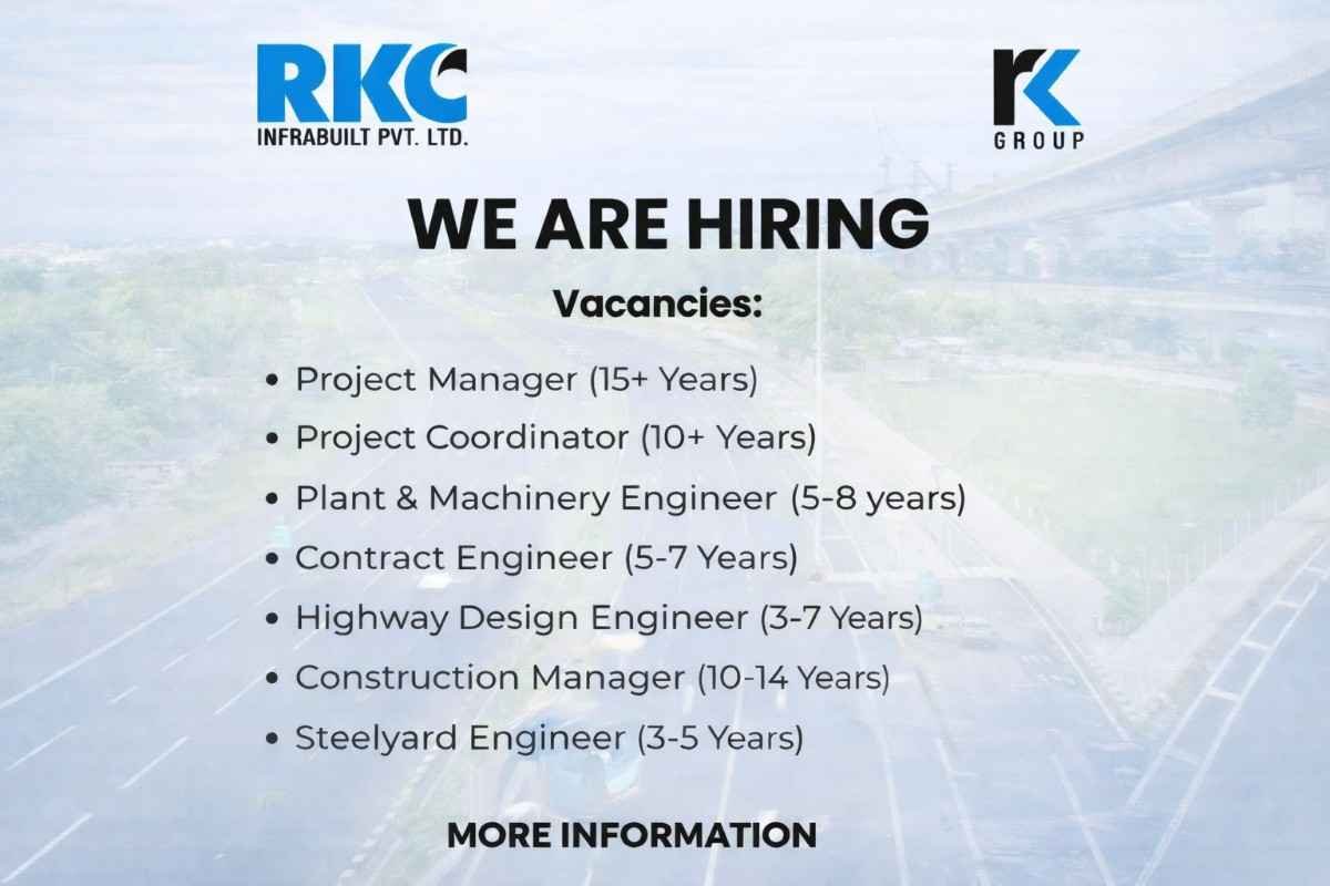 RKC Infrabuilt is involved in road, highway, and infrastructure development projects. This hiring drive offers opportunities in project management, design, contracts, and plant operations, ideal for candidates with highway project experience.