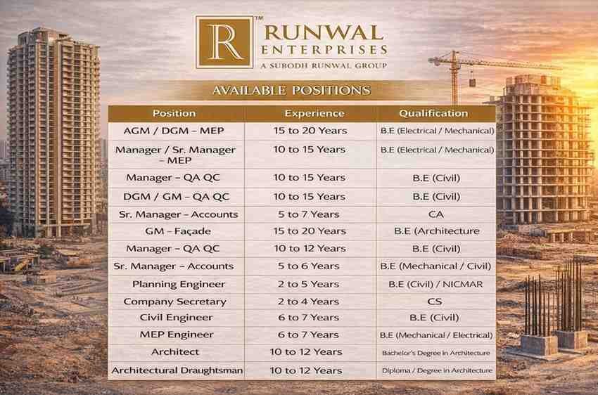Runwal Enterprises Urgent Hiring 2026 | For B,E/B,teck , Diploma Degree