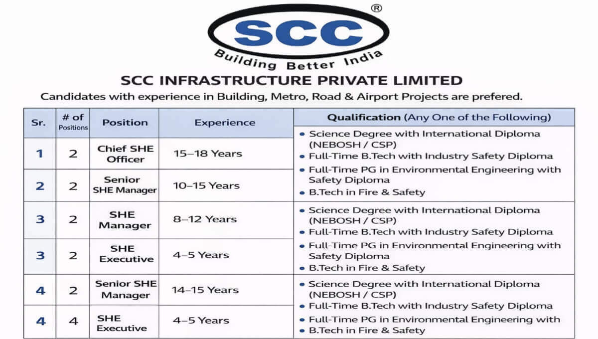 SCC Infrastructure Private Limited is inviting experienced SHE (Safety, Health & Environment) Professionals for projects across Gujarat.